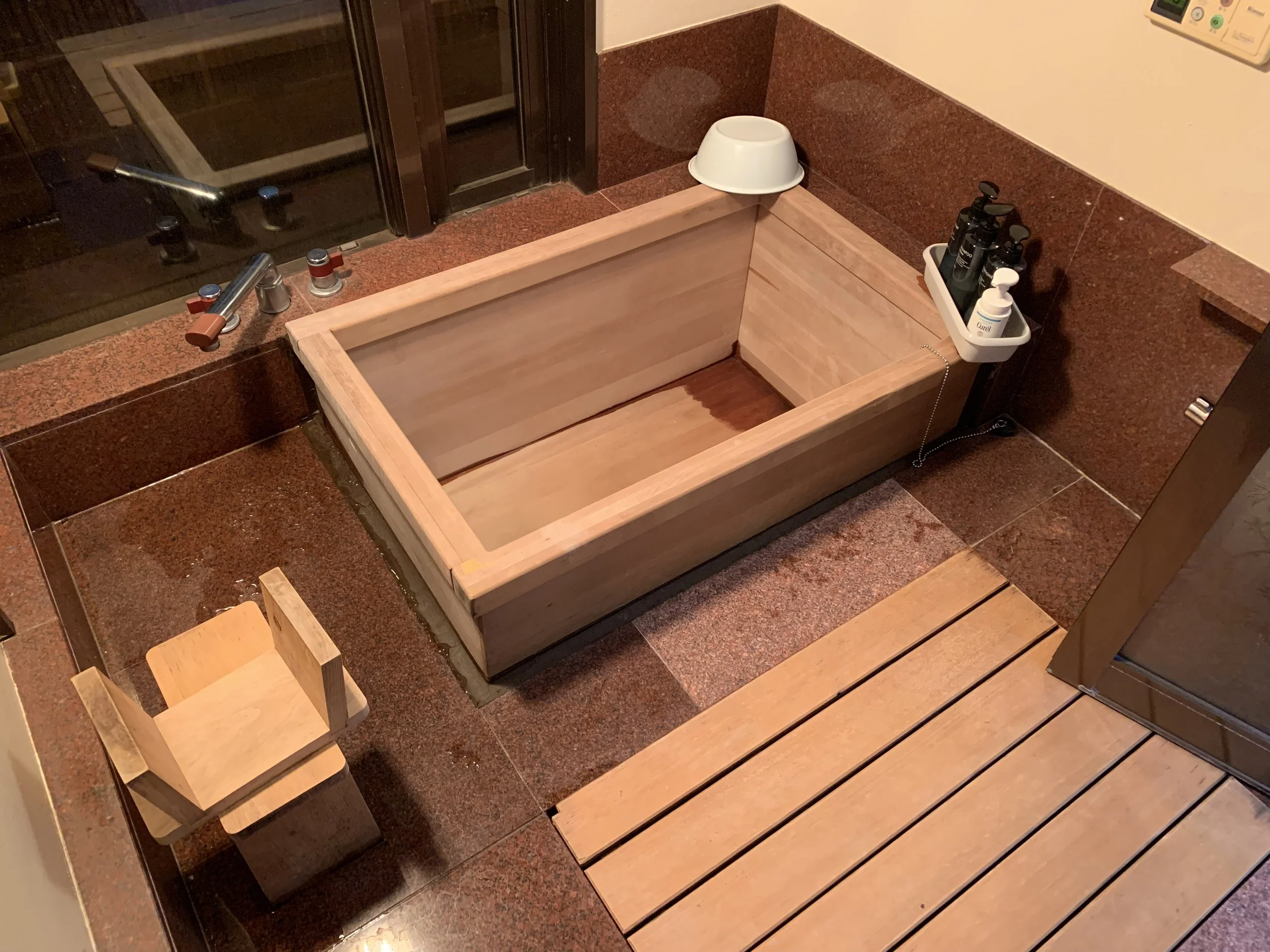 The shower room was full of wooden features that made the room feel warm and inviting.